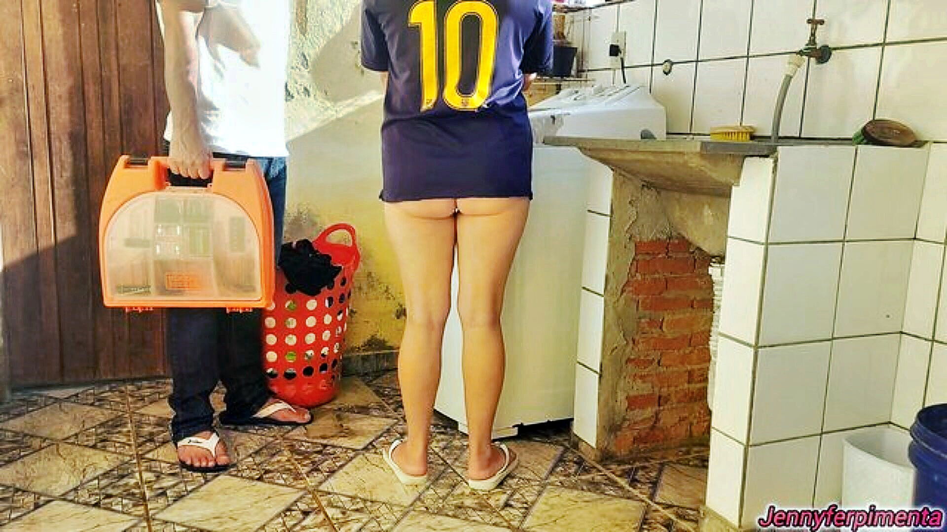 desperate husband fucks his neighbor in the bathroom when his wife is away craving her irresistible allure