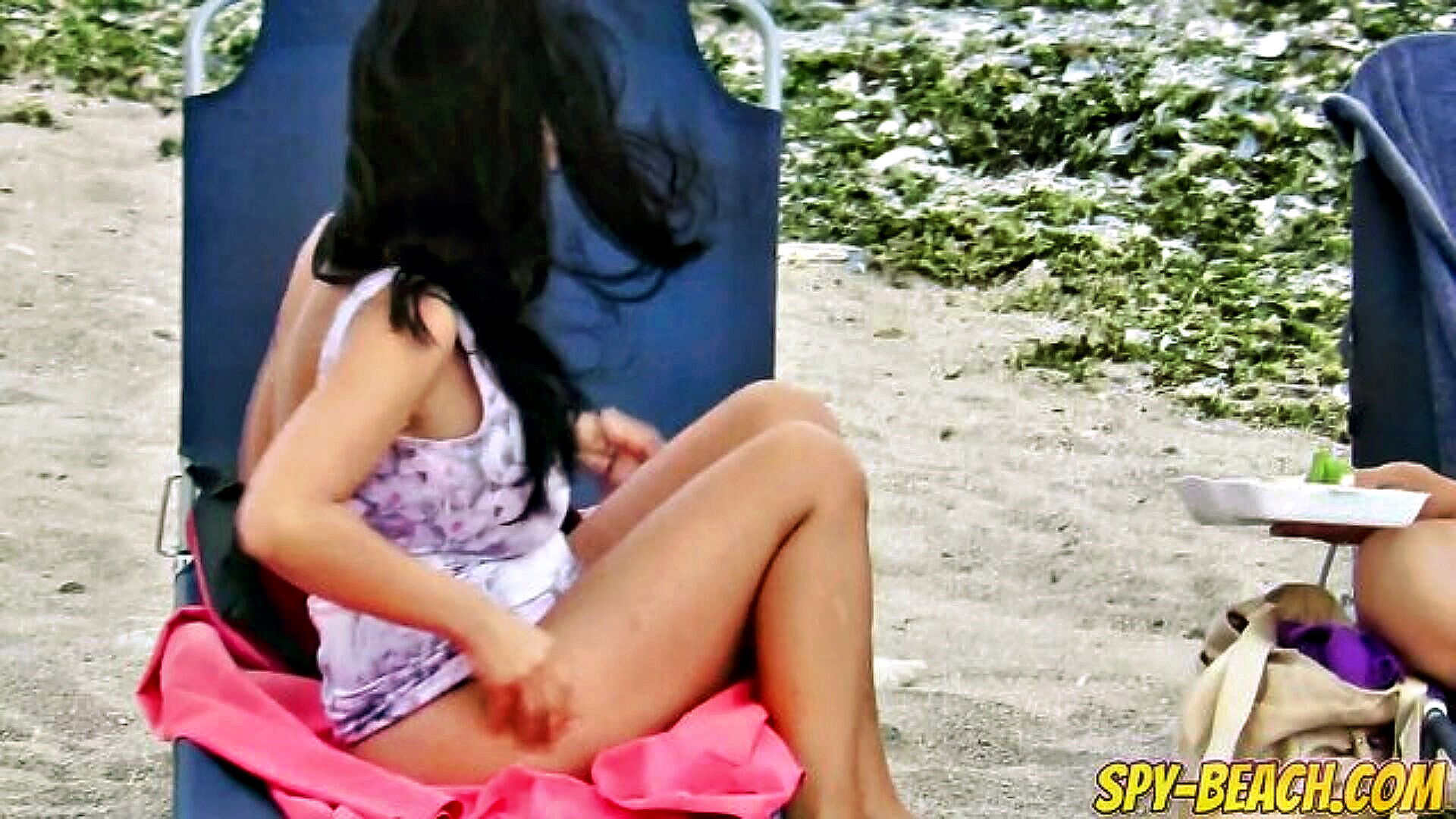 two busty women one blonde and one brunette sunbathe topless by the seaside