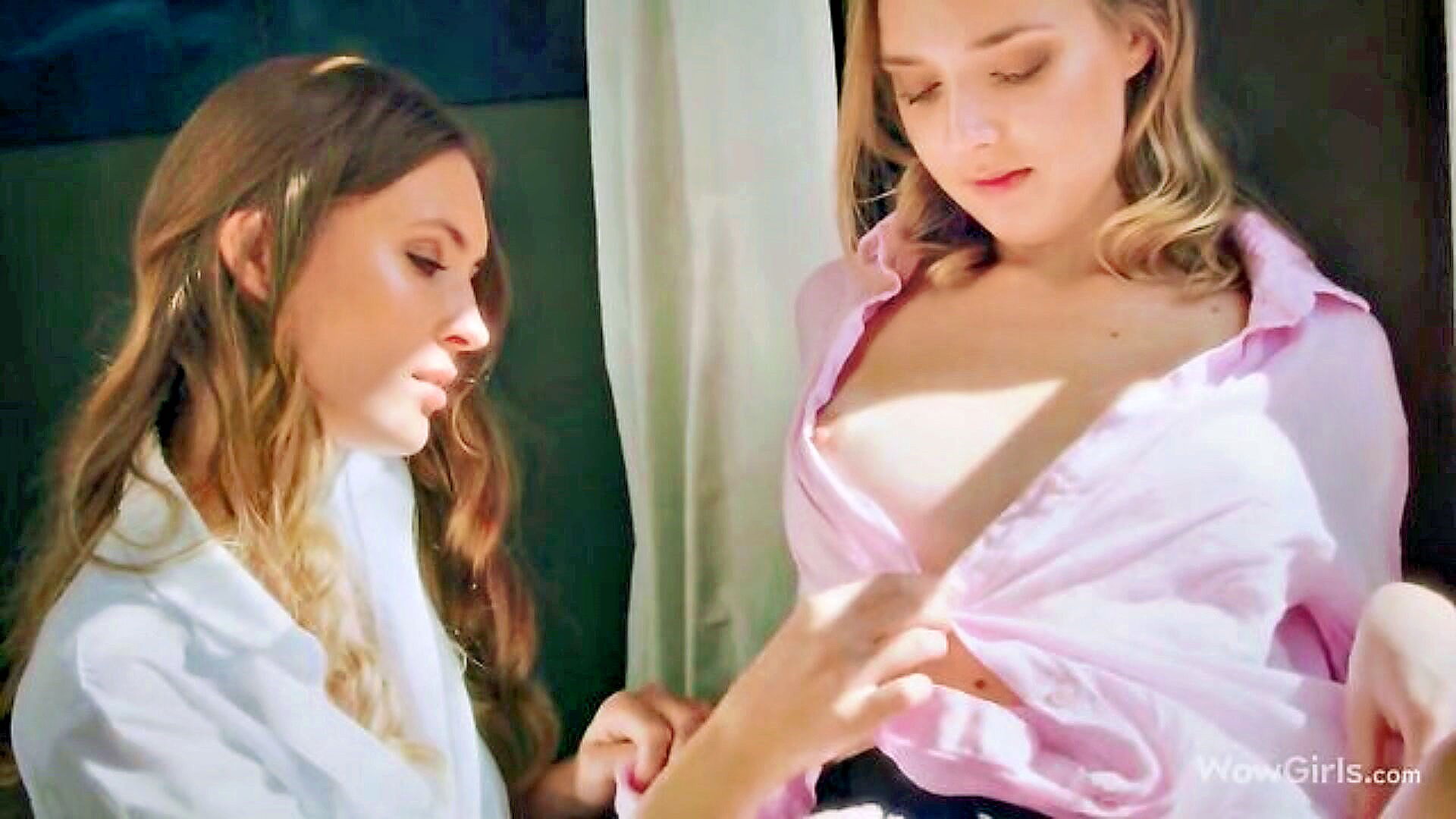 two brunettes indulge in lesbian sex and kisses in a rural cabin