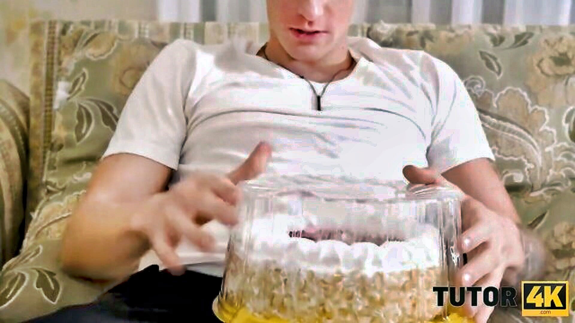 teen boy accidentally spills tea on blonde tutor and persuades her for a quick blowjob